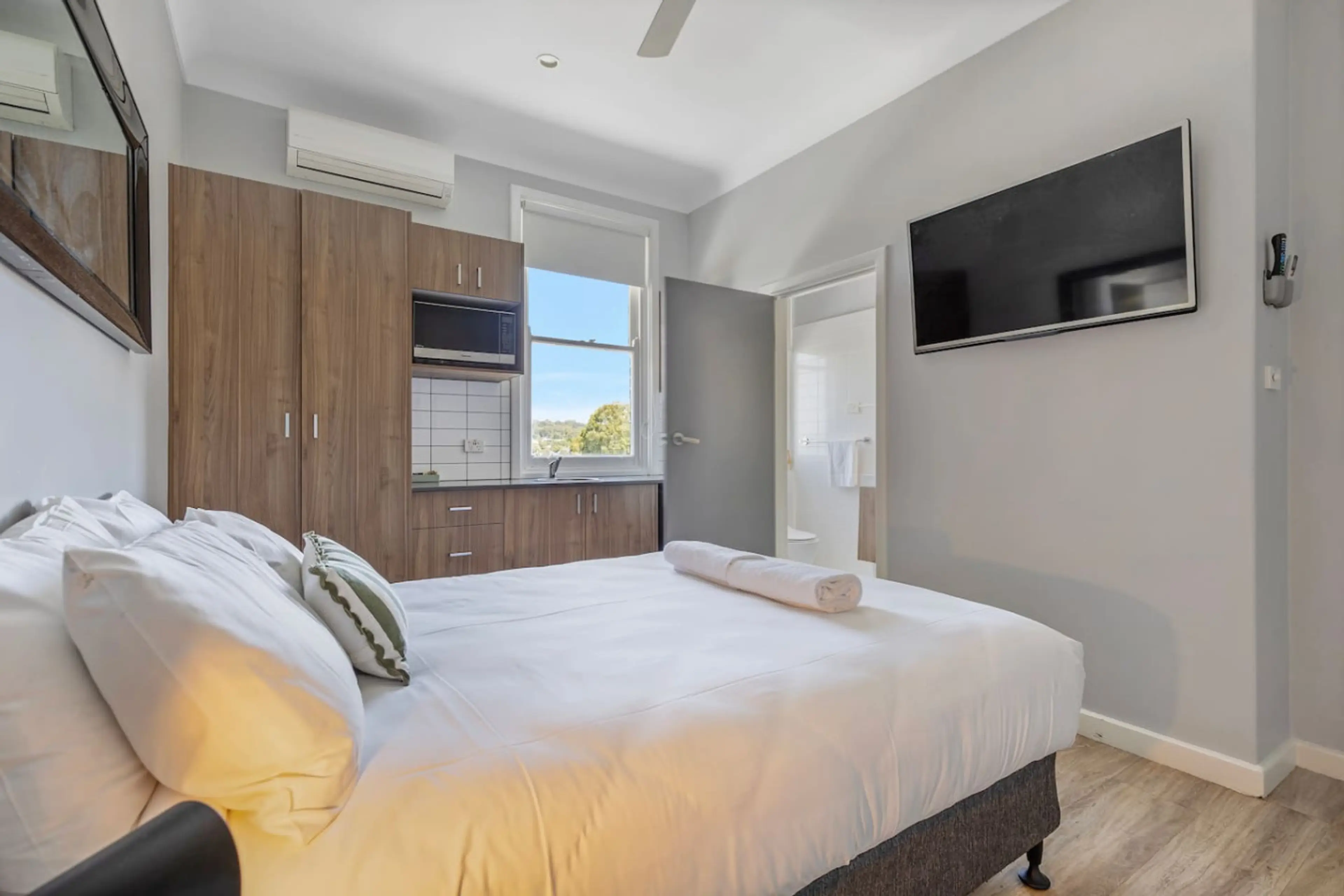 A modern queen studio designed for a comfortable and fuss-free stay. Featuring a plush queen bed and a private ensuite bathroom, this room is perfect for travellers who value convenience and privacy. After a long day, head downstairs to enjoy a meal, a drink, or simply soak in the relaxed pub atmos...